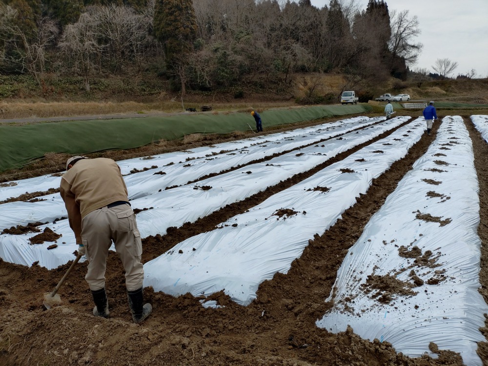 丸芋の畝立て、マルチ掛けを行いました。丸い丸芋になるよう願っています。